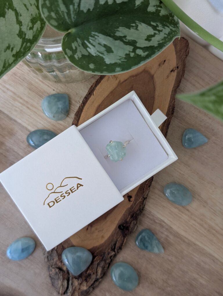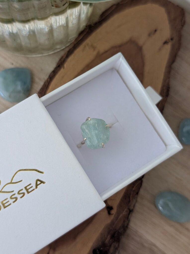 טבעת קלאסית מהממת! עשויה כסף 925 ואבן אקוומרין גולמית במראה לא מוחלק. גודל האבן כ-1 ס”מ, ייתכנו שינויים בדוגמת האבן