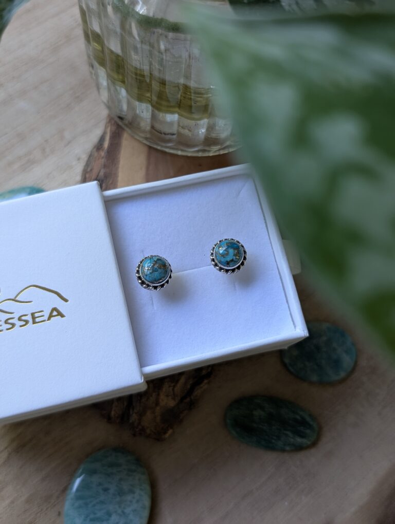 עגילי כסף מושלמים ועדינים, בסגנון בוהו! עשויים כסף 925, בעבודת יד מלאה, עם אבני טורקיז טבעיות. קוטר העגיל כ1.1 ס”מ