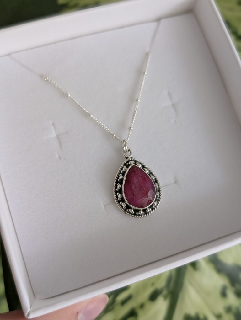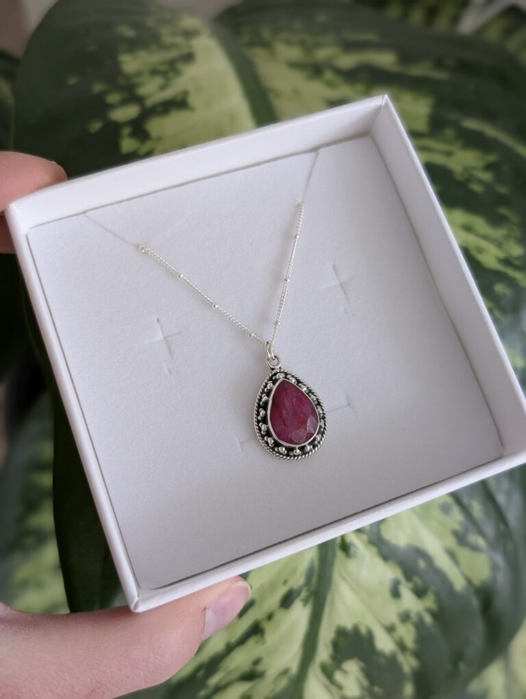 שרשרת עדינה ומושלמת! עשויה כסף 925 ואבן רובי טבעית מהממת. גודל התליון ללא הלולאה כ2 ס”מ, אורך השרשרת כ42 ס”מ. ייתכנו שינויים בדוגמה שעל האבן